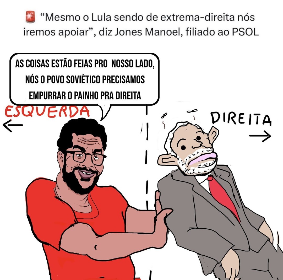 "Mesmo o Lula sendo de extrema-direita nós iremos apoiar", diz Jones Manoel, filiado ao PSOL. AS COISAS ESTÃO FEIAS PRO NOSSO LADO, NÓS O POVO SOVIÈTICO PRECISAMOS EMPURRAR O PAINHO PRA DIREITA. ESQUERDA. DIREITA.