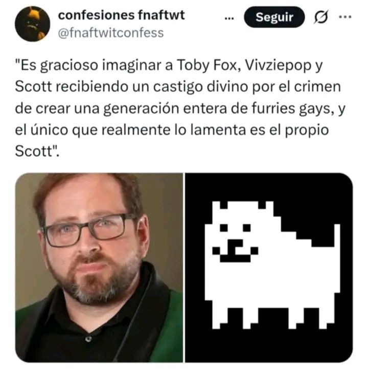 "Es gracioso imaginar a Toby Fox, Vivziepop y Scott recibiendo un castigo divino por el crimen de crear una generación entera de furries gays, y el único que realmente lo lamenta es el propio Scott".