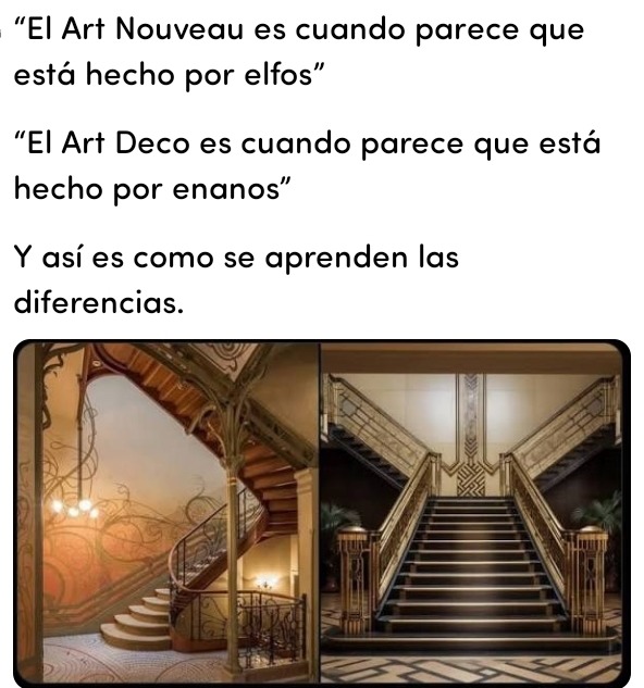 "El Art Nouveau es cuando parece que está hecho por elfos" "El Art Deco es cuando parece que está hecho por enanos" Y así es como se aprenden las diferencias.