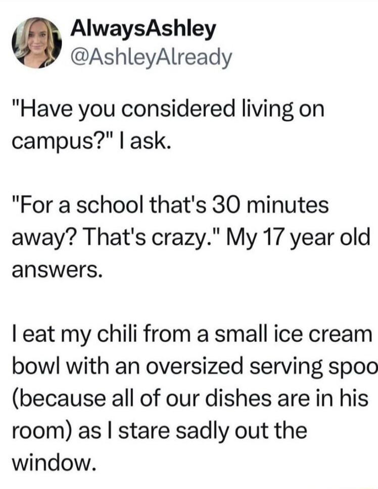 I eat my chili from a small ice cream bowl with an oversized serving spoon (because all of our dishes are in his room) as I stare sadly out the window.