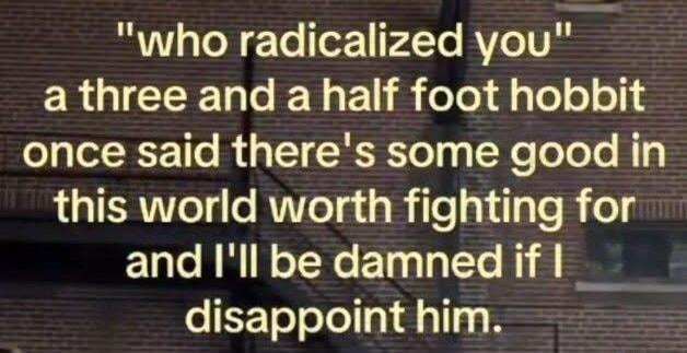 "who radicalized you" a three and a half foot hobbit once said there's some good in this world worth fighting for and I'll be damned if I disappoint him.