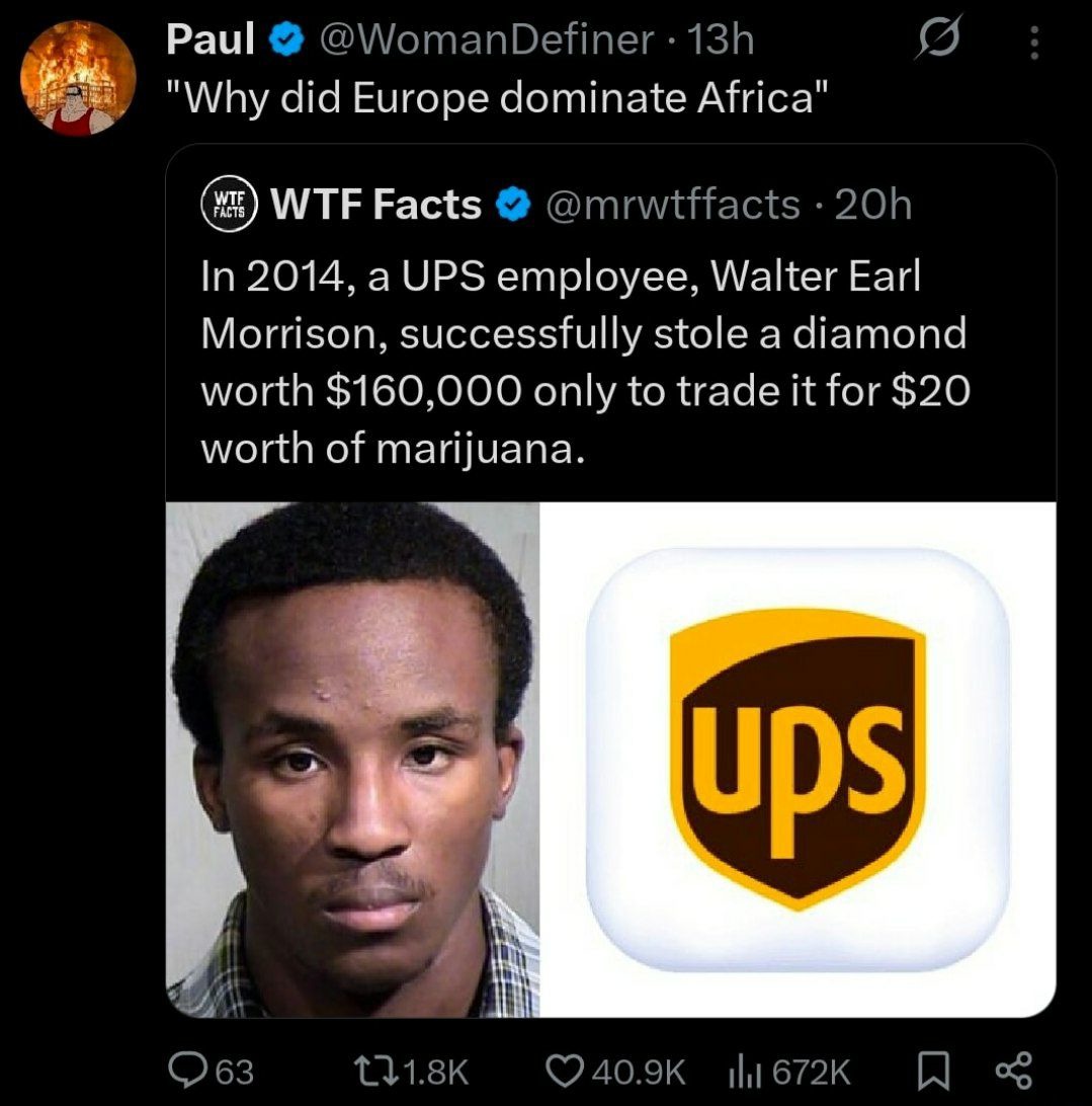 "Why did Europe dominate Africa"\n\nIn 2014, a UPS employee, Walter Earl Morrison, successfully stole a diamond worth $160,000 only to trade it for $20 worth of marijuana.