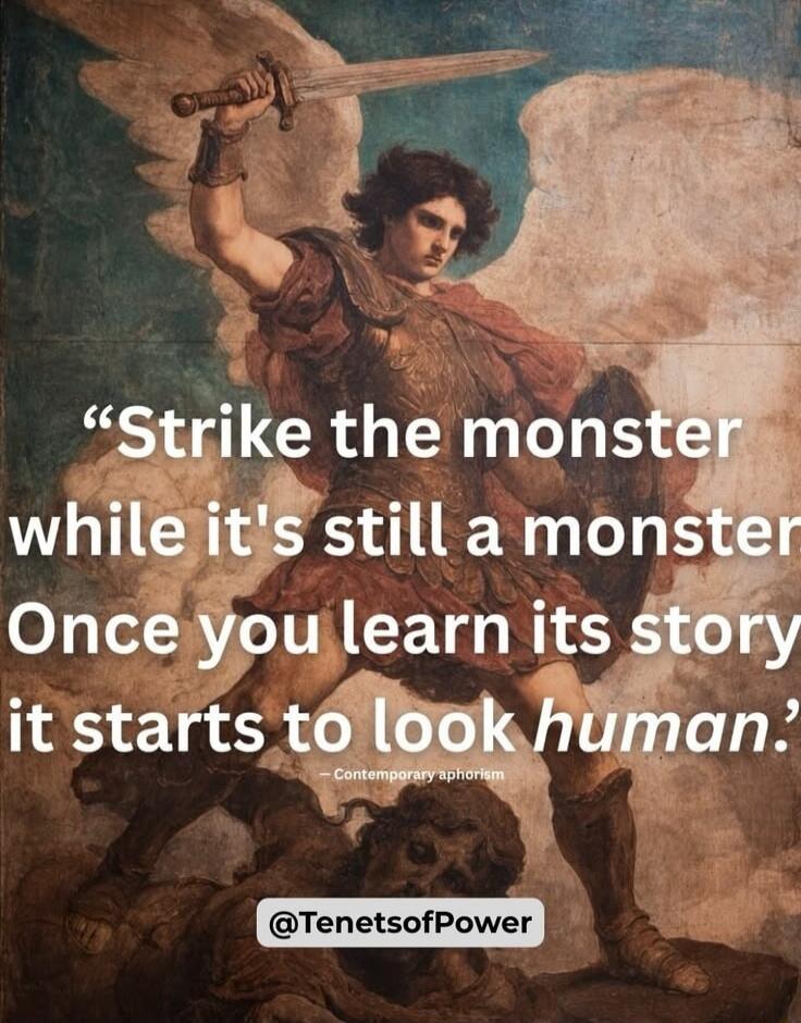 "Strike the monster while it's still a monster. Once you learn its story it starts to look human."