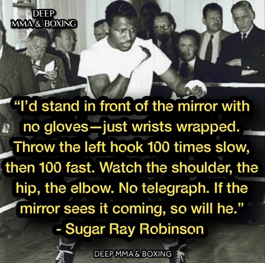"I'd stand in front of the mirror with no gloves—just wrists wrapped. Throw the left hook 100 times slow, then 100 fast. Watch the shoulder, the hip, the elbow. No telegraph. If the mirror sees it coming, so will he." - Sugar Ray Robinson