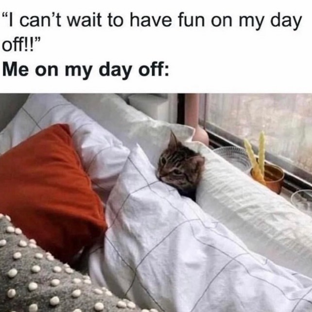 "I can’t wait to have fun on my day off!!"\nMe on my day off: