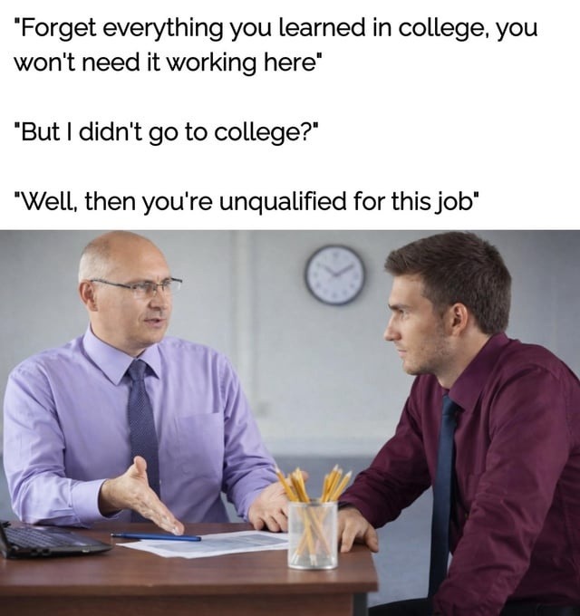 "Forget everything you learned in college, you won't need it working here" "But I didn't go to college?" "Well, then you're unqualified for this job"