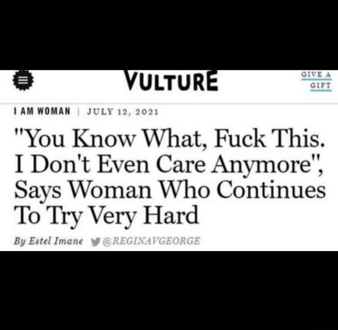 "You Know What, Fuck This. I Don't Even Care Anymore", Says Woman Who Continues To Try Very Hard
