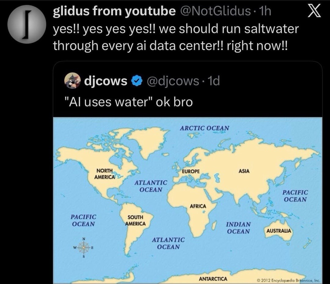 "AI uses water" ok bro. yes!! yes yes yes!! we should run saltwater through every ai data center!! right now!! (Text on map: Pacific Ocean, North America, South America, Atlantic Ocean, Europe, Africa, Asia, Indian Ocean, Australia, Arctic Ocean, Antarctica)