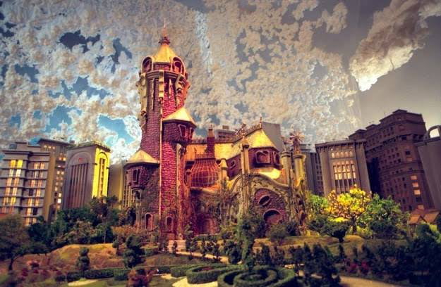 Um frango assado inteiro colocado sobre uma pizza dividida em duas metades: uma salgada com queijo, azeitonas e tomate, e outra doce com cobertura de chocolate, granulado e confeitos coloridos.