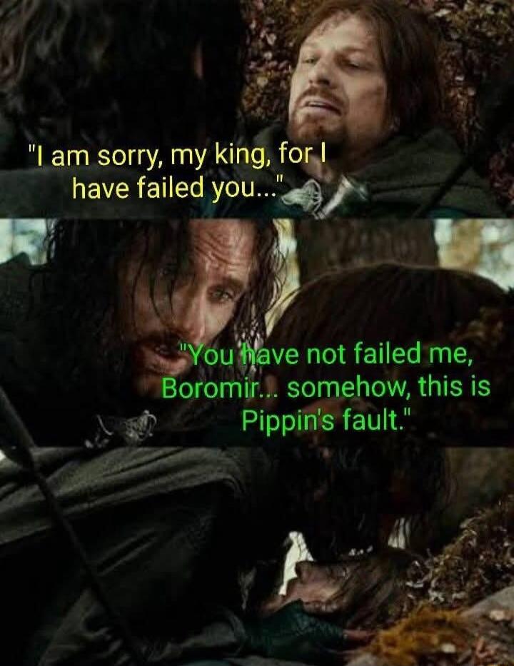 "I am sorry, my king, for I have failed you..." "You have not failed me, Boromir... somehow, this is Pippin's fault."