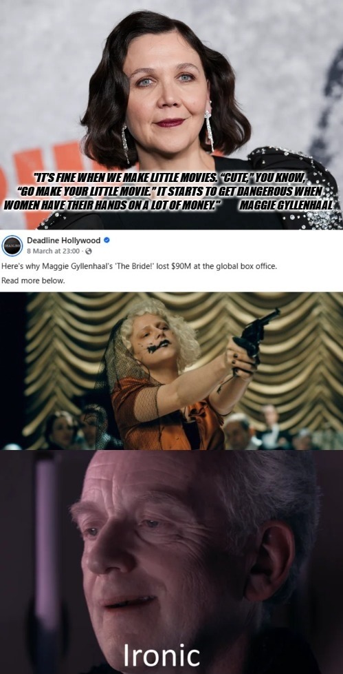 Say what you will about the scumbags who ran Hollywood 25 years ago, but those guys certainly knew what the American people wanted to see. You wanna fix the film industry? Take it away from the theater kids & give it back to the bullies & degenerates. Maggie Gyllenhaal's 'The Bride!' opens to $7.3M at the domestic box office. Production budget was