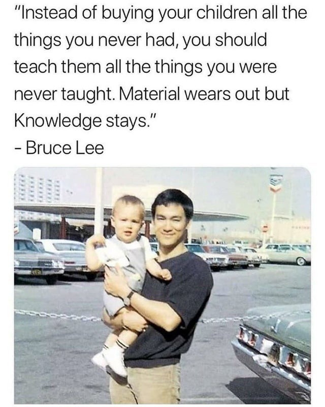 "Instead of buying your children all the things you never had, you should teach them all the things you were never taught. Material wears out but Knowledge stays." - Bruce Lee