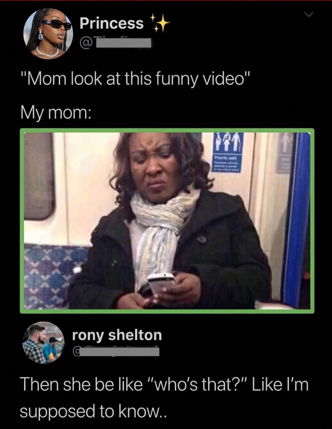 "Mom look at this funny video" My mom: